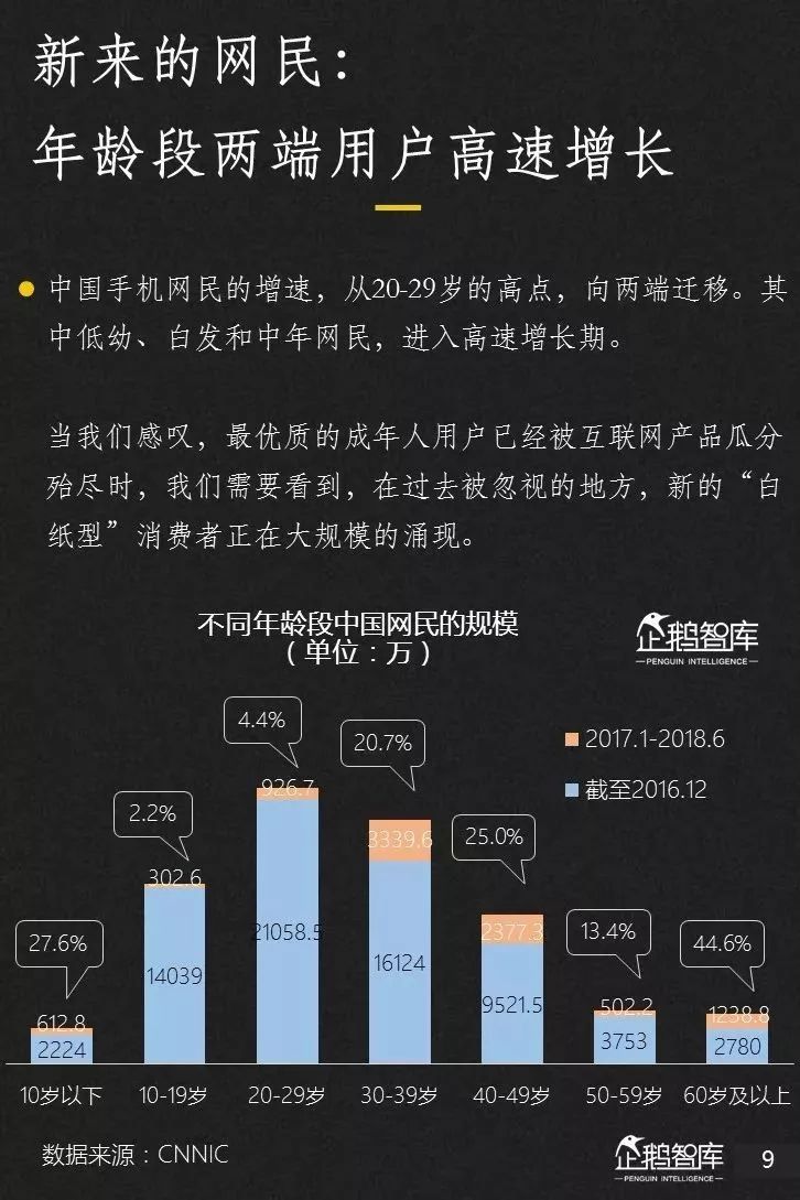 中国手机网民的增速,从20-29岁的高点,向两端迁移。其中低幼、白发和中年网民,进入高速增长期。