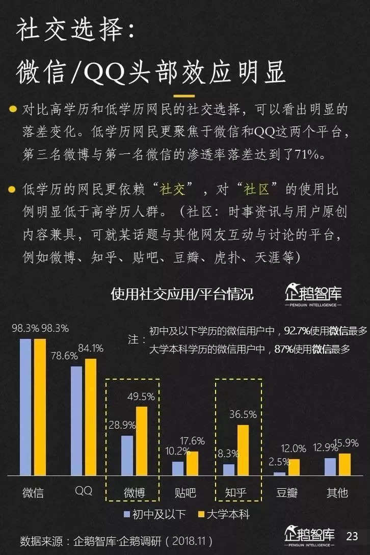 社交是今天移动互联网的核心场景,在对比低学历和高学历网民时,我们发现了一个明显特征。