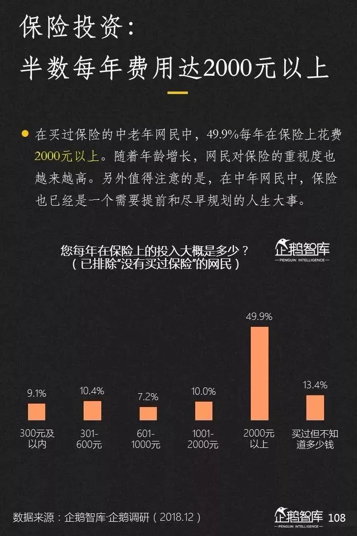 在购买保险方面,有过购买经历的中老年网民,每年金额集中在2000元以上区间,甚至更高;在体检方面,有过体检经历的中老年网民,超过半数的体检频率可以保持每年至少一次。