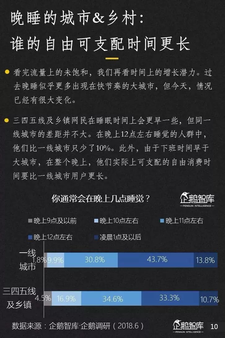 看完流量上的未饱和,我们再看时间上的增长潜力。过去晚睡似乎更多出现在快节奏的大城市,但今天,情况似乎已经有很大的变化。