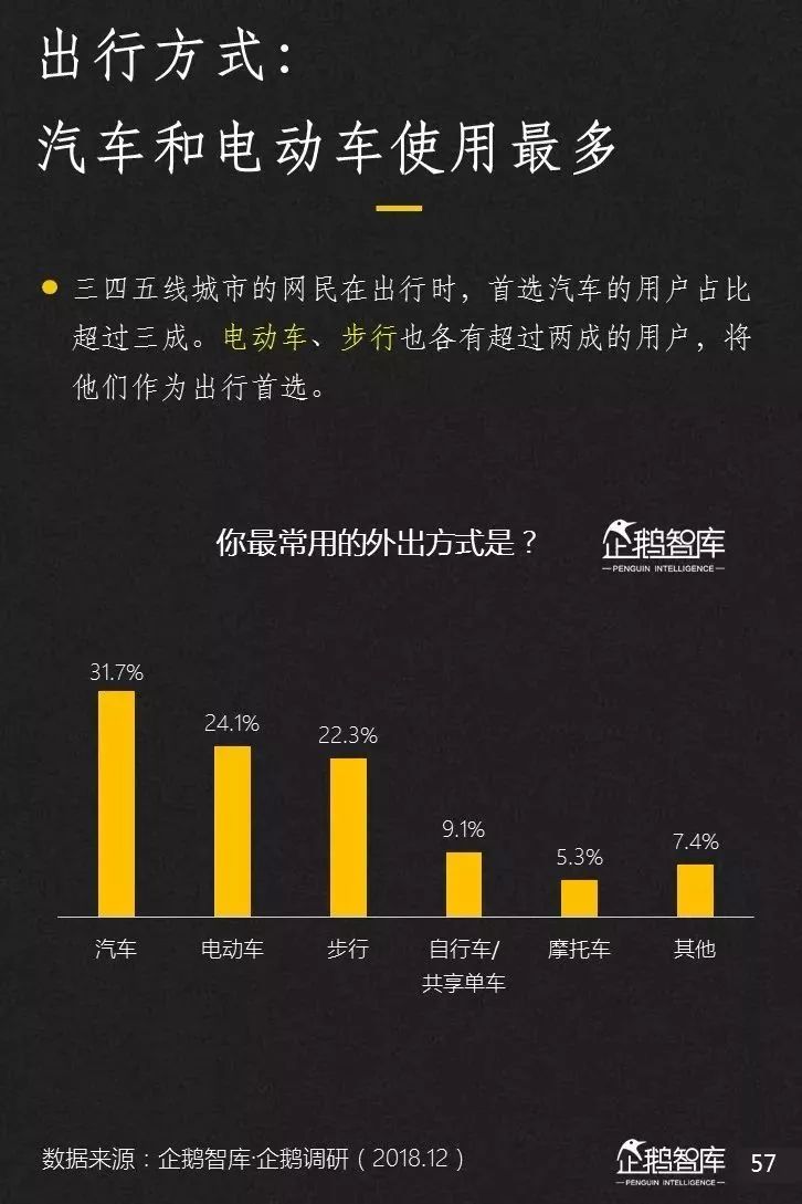 尽管汽车(包括 私家车和公共交通)仍是排名第一位的出行工具,但电动车在三四五线的交通中同样占据了非常重要的位置。