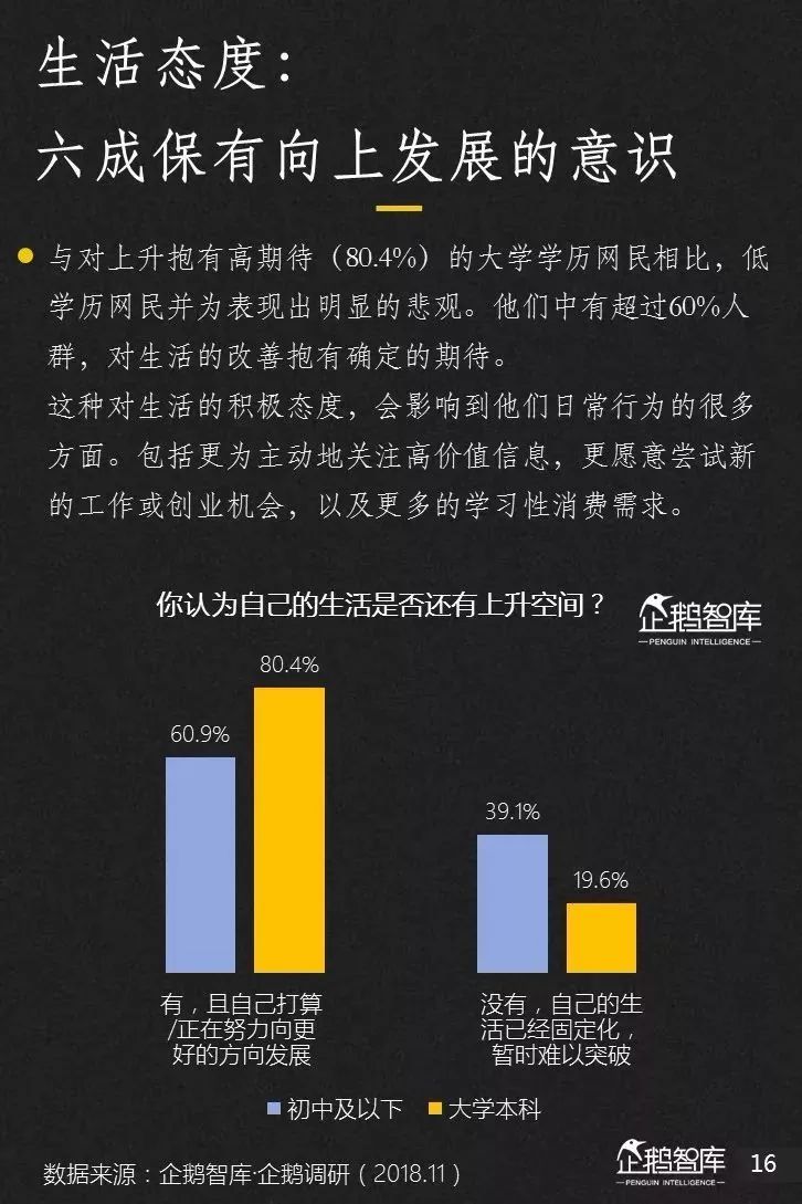 还有我们非常看重的,向上的生活态度。它会在很多方面影响到低学历网民参与到社交、资讯等信息流转选择,以及泛娱乐内容的口味和沉浸度。
