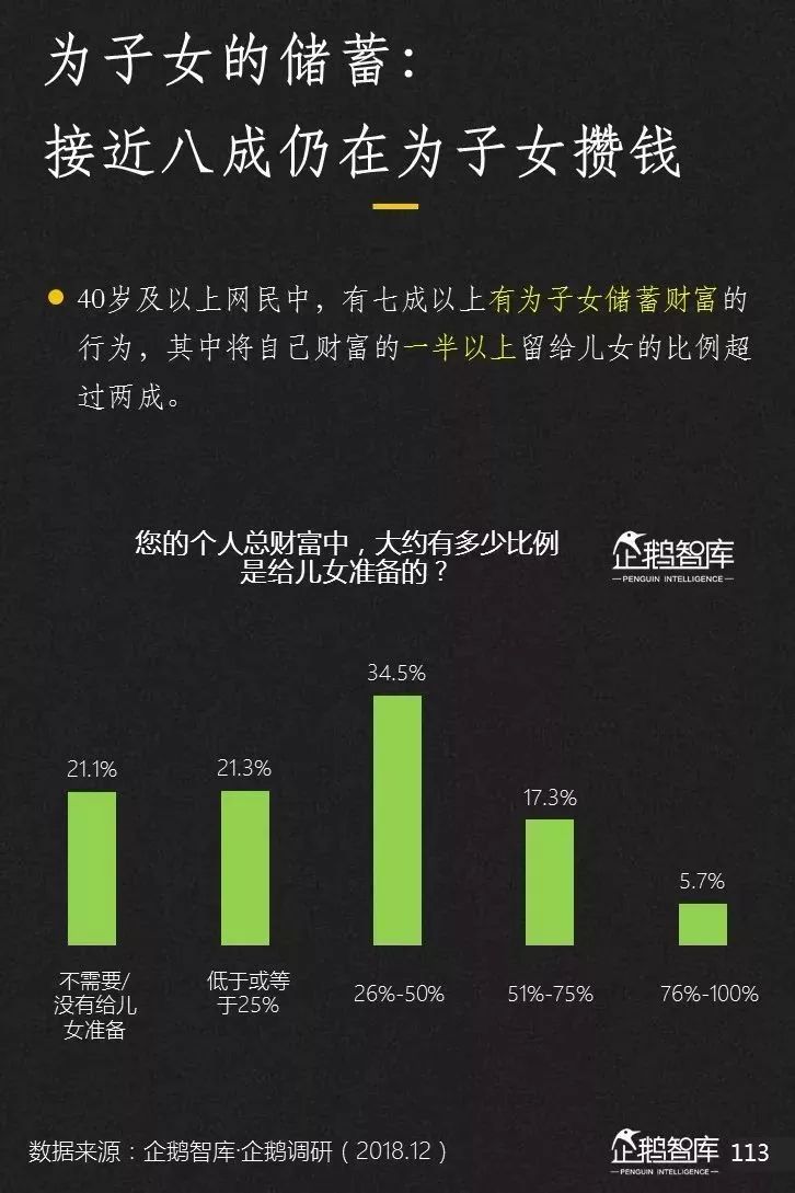 在中老年网民中,有接近八成在为子女攒钱,其中规划将自己财富的一半以上交给子女的网民,占比约为23%。