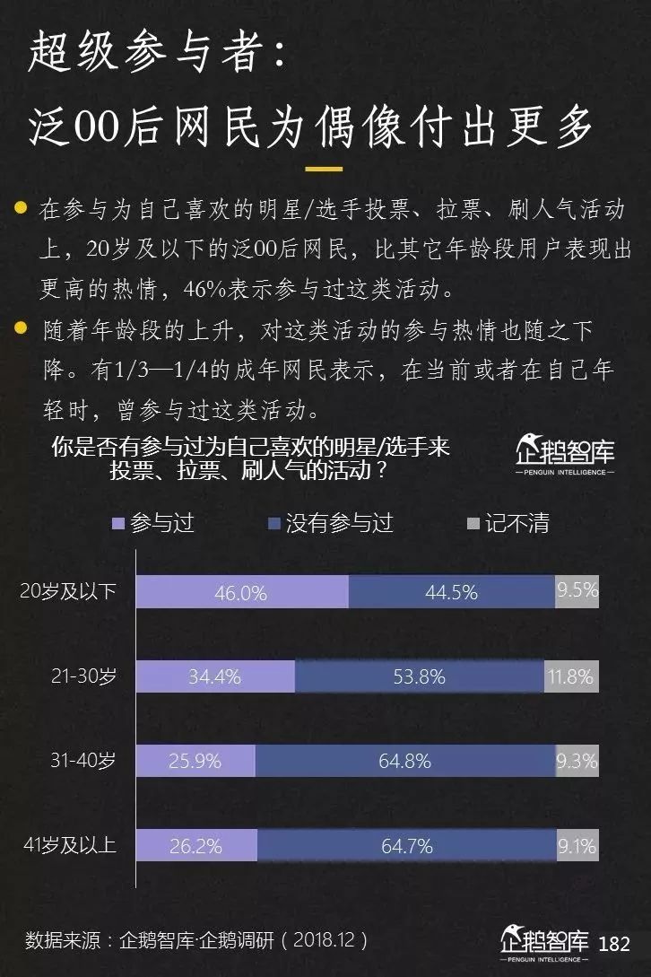 我们看到的现象和数据中,20岁以下年轻群体在追星的热情和消费上,都领先于其他群体,特别是年轻女性。但同样值得我们注意到是,在21-30岁,甚至31-40岁成年人中,关注偶像和为此消费的比例同样可观。