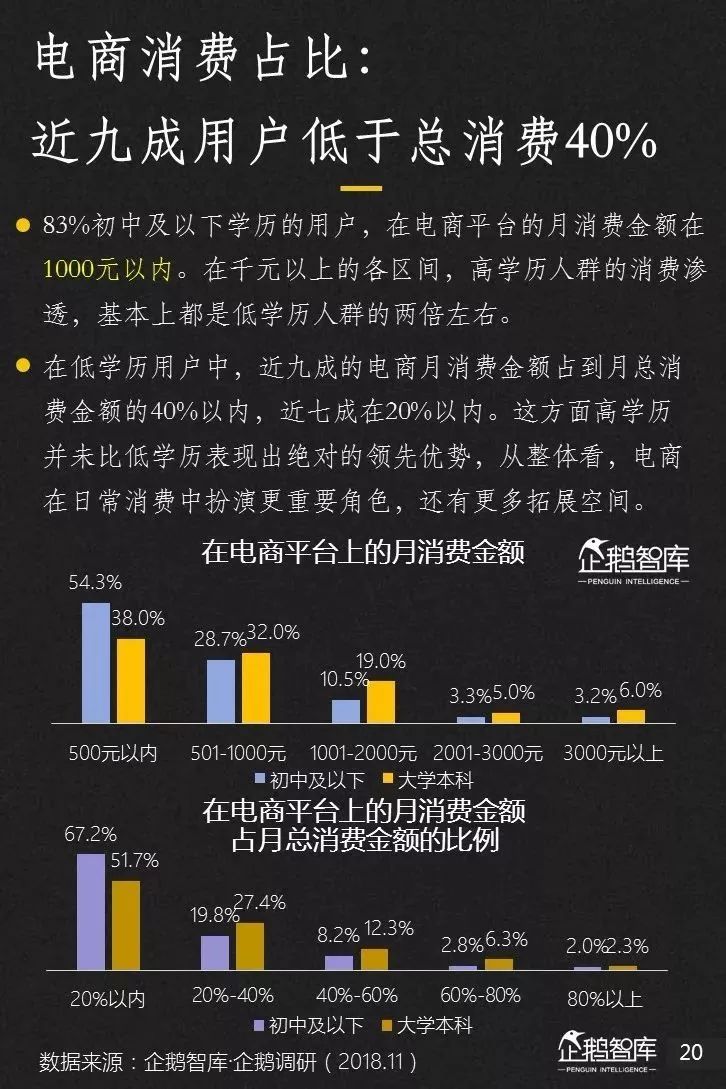 淘宝、京东、天猫仍然占据了最重要的市场份额,拼多多成为新崛起者。在消费额度,占比等方面,低学历人群均呈现出值得期待的潜力。