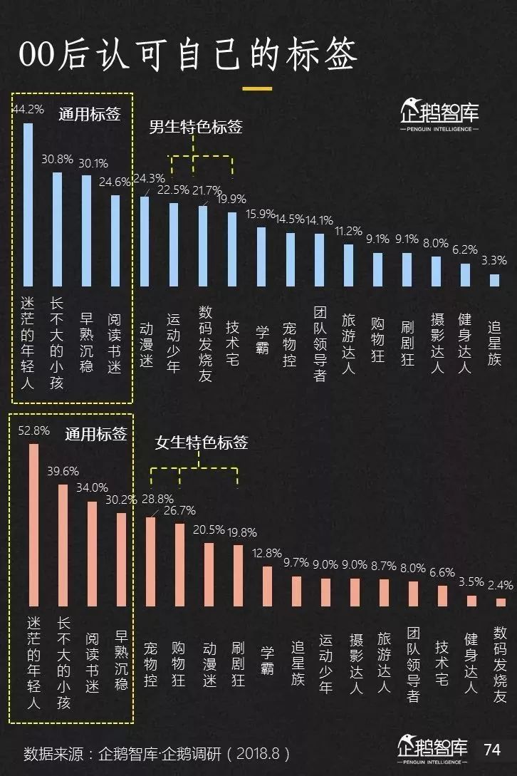 男孩们对运动和数码产品更为痴迷,女孩们则更喜欢把自己的身份与宠物控,购物狂联系在一起。至于动漫,则是男女们都喜欢的一类。
