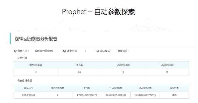 另外,模型调参也是一个比较复杂的过程。通常来讲,调参是一个寻找全局最优的方式。但调参又不是一个凸函数,所以它很容易找到局部最优。先知平台嵌入了自动调参的算法,我们把训练集合和测试集合放进去,系统可以自动告诉你一个相对比较优的参数组合。自动调参功能的实现让普通的业务人员也可以轻松完成过去只有数据科学家才能完成的工作。