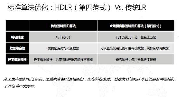另外一条路其实是像谷歌、百度走的方向,是微观特征和简单模型。例如我们依然使用逻辑回归的算法,但是我们把一个变量的数量提升到亿级别甚至几十亿级别,这样通过变量的组合,同样可以用线性模型表达非线性的问题,从而得到比较好的效果。