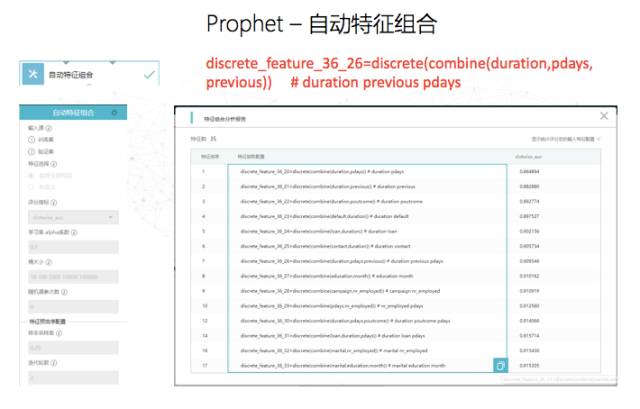 实际上,数据当中还有多少组合,数据科学家不一定能够轻易判断出来。所以先知具备自动特征组合的探索功能,在一个非常广的空间里面,通过本质上是一个暴力搜索的方式进行探索。实际上由于计算代价很高,纯粹的暴力搜索是做不到的。我们通过一些算法,将它降到一个正常情况下可以接受的时间内,且能做到5阶甚至6阶的有效特征,这个其实可以大大减少科学家的工作量,以及对数据理解的时间。