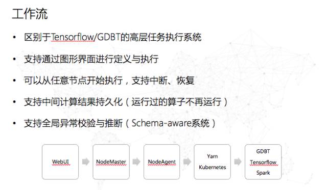 先知本质上来讲,在Web上做的UI提交的任务,可以通过一个Kubernetes的架构,它会翻译成一个Spark的任务或者GDBT的任务。也就是说,我们在界面上拖拖拽拽的结果中间会转换成图,然后进行一定的优化和执行。所以说先知里面其实是有一个比较高层次的任务执行工作流引擎。