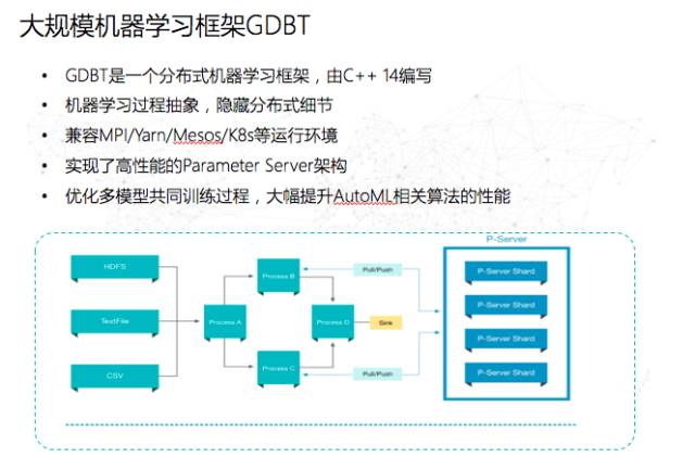 基于此,第四范式自主研发了大规模分布式并行计算框架GDBT(General Distributed BrilliantTechnology)。我们自主研发机器学习框架的目的,是因为像Tensorflow这类的机器学习框架面向的是“深”,就是我们前面所讲的左上角的象限,它可以接受比较小的数据输入,但要做比较复杂的结构,就需要非常多经验丰富的机器学习专家,针对一个问题要花费三个月甚至是更长时间才能调出一个好的模型。