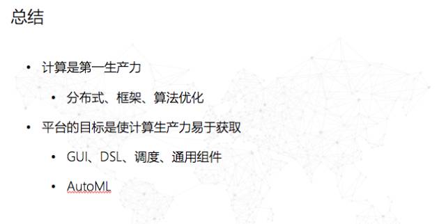 总结上来讲,先知作为一个平台的目标是使计算的生产力易于获取,我们尽量让大家用GUI和简单的脚本形式,表面上看起来和传统用SaaS做一个模型是一样的,背后实际上是一个高维度的机器学习的框架。对于机器学习来讲,计算是第一生产力——调参的过程就意味着将一个机器学习的过程做几十次或者上百次,而先知的GDBT框架比Spark可以快上数百倍,这就意味着在同等时间内、同样的计算资源下,先知能有探索更高维度模型的机会,最终减少对使用者的需求。