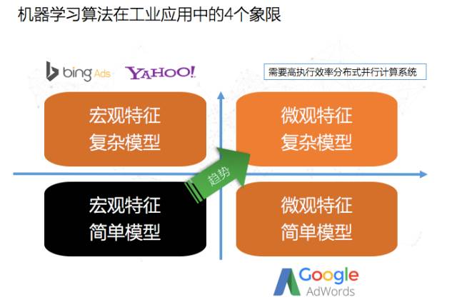 右上角是一个微观特征和复杂模型的象限,可以认为是一个由多个模型集成的一个非常深度的网络,或者是一个非常复杂的网络结构,同时会使用大量的变量。现阶段工业界还难以做到这一点,因为其需要几千台机器来去解决一个问题,成本过高。