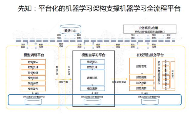除此之外,企业在实际构建人工智能应用的过程当中,如何将已经做好的模型投入到生产中是非常重要的环节。我们刚刚讲到,假设我们已经有了几千万个特征甚至几亿个特征变量,意味着最后可以生成上亿的规则,这些规则如何在系统中应用呢?比如在反欺诈系统中,可能要在20毫秒之内,判定一个交易是不是欺诈。所以对于每个企业来讲,需要一个极强的线上分布式预估系统。目前,只要有足够的底层计算资源,先知平台可以通过一个非常简单的方式,就可以形成一个处理上万并发请求的实时接口。下图就是先知平台的架构,刚刚界面里面是调研的平台,我们可以通过拖拽的方式完成模型训练的过程。另外还有自学习平台和预估服务平台,把源源不断的知识送到模型系统中,从而让它适应新的环境,并且提供实时的在线应用。