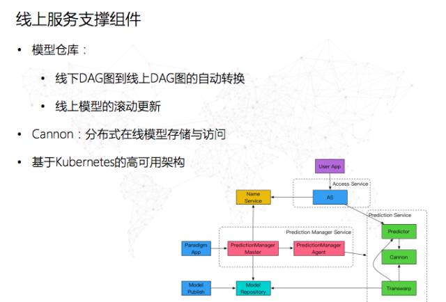 此外还有线上服务的支撑,我们刚才讲到用Web层去做的先知的流图,其实它在转化成线上的DAG图的时候,通常要做一些数据拼接、特征工程、特征转换等工作。先知有一个模型工厂、模型仓库的概念,从线上到线下JAVA程序的转变是自动完成的。