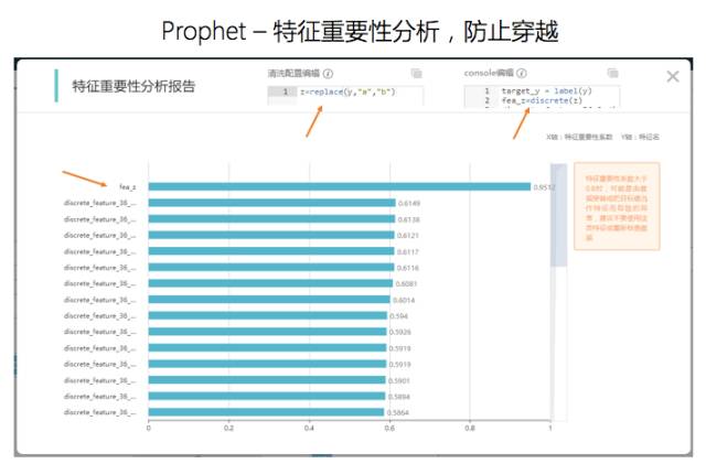 另外,特征重要性分析防止穿越。比如,我们用过去的交易行为数据来判断该用户是否会在短信营销之后,购买理财产品。因为用户购买理财产品要预测的事情,我们不会把它当做已有的变量,而用户资产会随着买理财的数额发生变化。所以,一旦把用户购买的资产作为一个特征的话,就会发现凡是用户在月底资产上升的都喜欢买理财产品,这就是一个典型的穿越特征。并不是因为该用户资产上升,才喜欢买理财产品,而是因为他买了理财产品之后资产才上升。