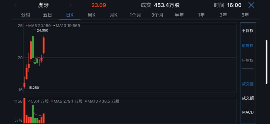由下图可见,虎牙发行价为每股12美元,上市首日上涨34%,最新收盘价更是达到23.09美元,较之发行价上涨近90%。