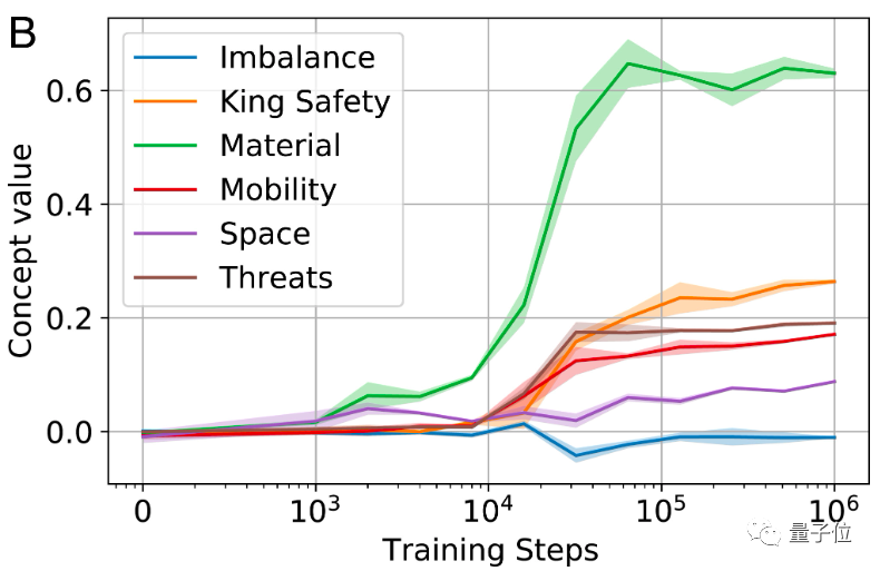 此外,研究者还观察了人类棋手及国际象棋编程所看重的重要参数,随训练过程的变化,其中包括:国王安全度(King Safety)、一方棋子总战力(Material)、机动性(Mobility)、走棋威胁性(Threats)等。