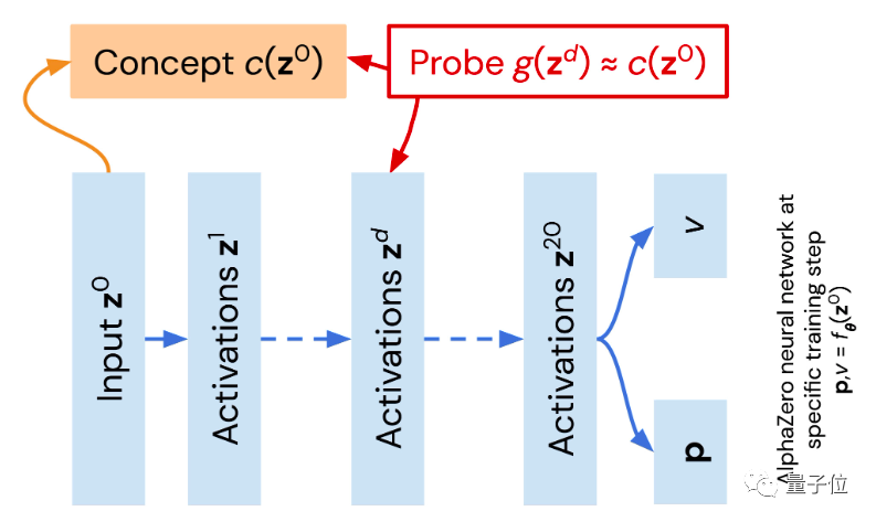 再从AlphaZero角度,设一个广义线性函数g(zd),作为在不同层取值的探针。训练设定下,g(zd)将不断趋近𝑐(𝐳0),研究者通过观察g(zd)与𝑐(𝐳0)近似情况,以确认系统是否理解相关概念。