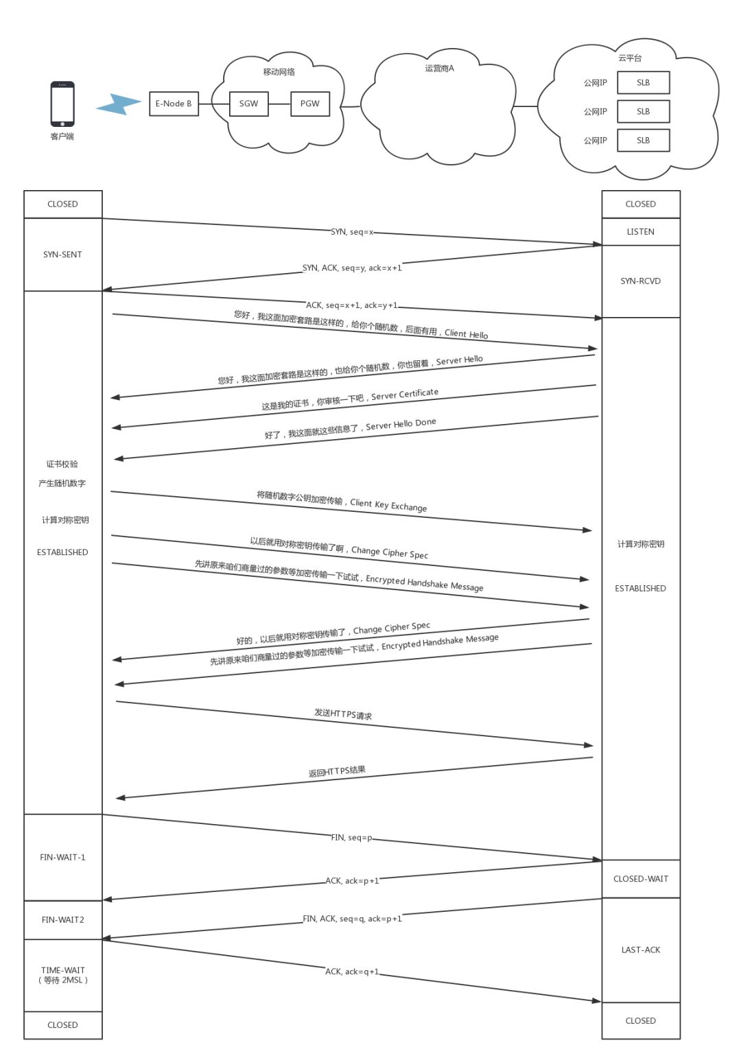 HTTPS协议是基于TCP协议的,因而要先建立TCP的连接。在这个例子中,TCP的连接是从手机上的App和负载均衡器SLB之间的。也就是唐僧和金顶大仙之间,到了金顶大仙,就不怕了,会指引到佛祖那里的。