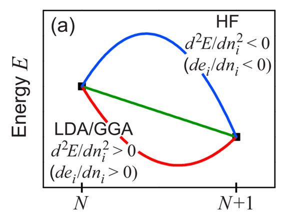 图3. 体系基态能量与电子占据数的关系。蓝线:HF 理论结果;绿线:Koopmans 理论结果,即真实情况;红线:LDA 或 GGA 近似结果。[图片来源:Phys. Rev.B 80, 085202 (2009)]。