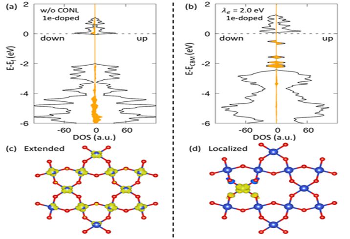 其次,不出意外,对掺杂后的体系,未经修正的 DFT 方法预测出“浅掺杂”的物理图像。也就是说,掺杂电子后,费米能级移动到了母体材料的导带 (图5a),掺入载流子离域的分布在整个体系之中 (图5c)。这明显与实验观测到的不导电现象相违背。有趣的是,修正后,体系能量与电子占据数满足线性关系 (图3绿线),成功得出了“深掺杂”的物理图像。掺杂引起的效果不再是简单的移动费米能级,而是在母体材料带隙之间引入了新的态。该电子态由原本分布在价带和导带的铜 3d 电子完全占据 (图5b)。掺入的电子并没有成为期待的“自由载流子”,而是局域在一个铜原子周围,引起了局域形变,形成极化子 (图5d)。也就是说,电子掺杂后,ZnCu3(OH)6BrF 并没有实现半导体到导体的转变,而只是大大减小了母体材料的带隙。