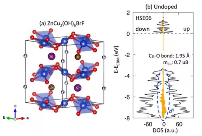 图4. (a) ZnCu3(OH)6BrF 结构示意图。(b) 未掺杂的ZnCu3(OH)6BrF 态密度图。