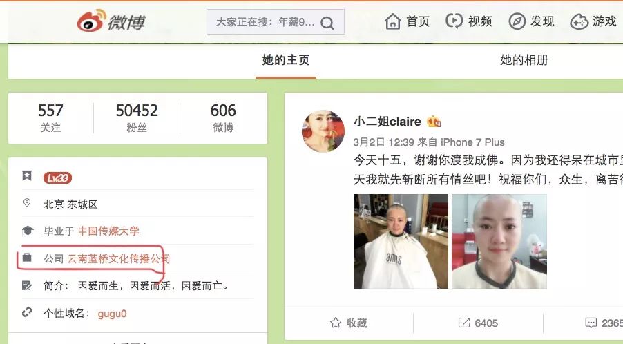 现在,在电脑端微博,查看她的认证资料,发现她的公司是“云南蓝桥文化传播公司”: