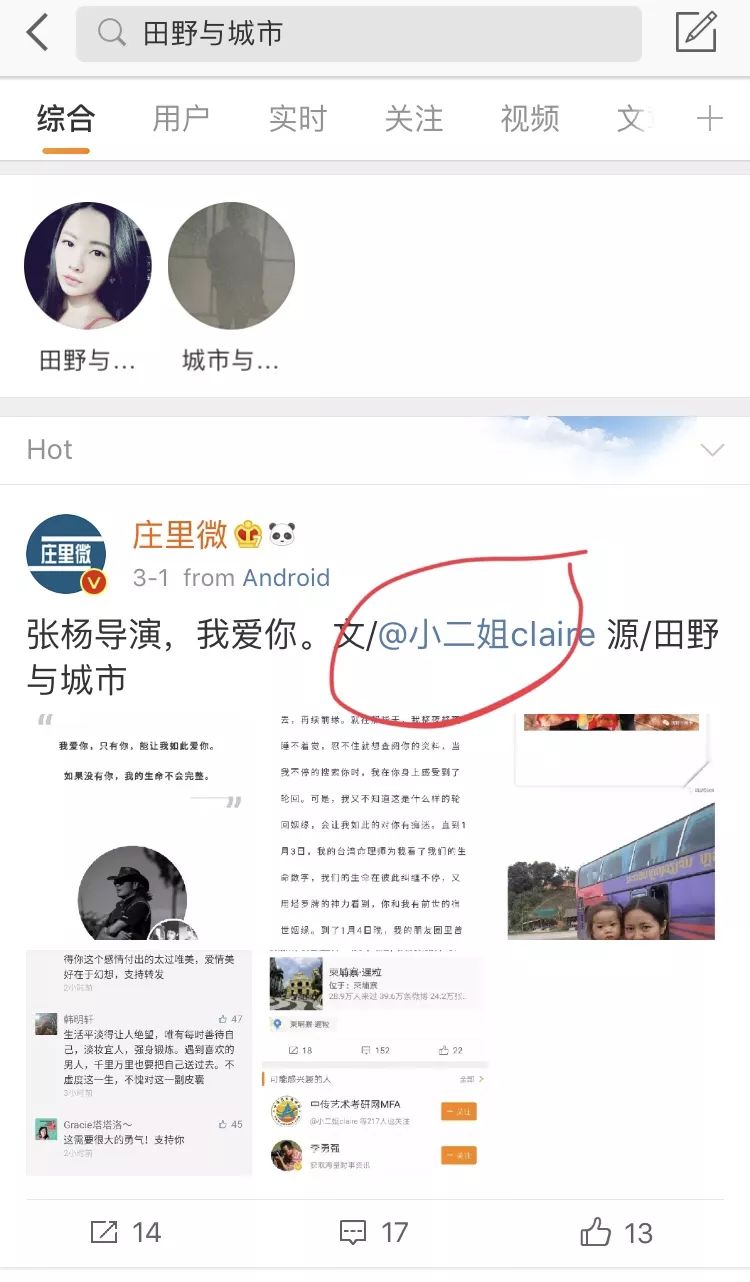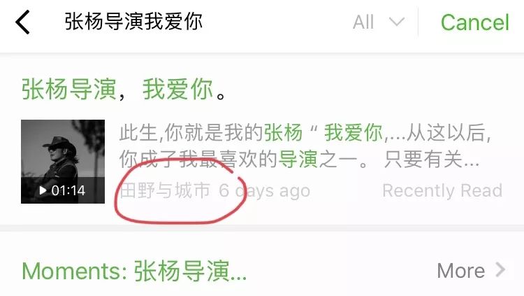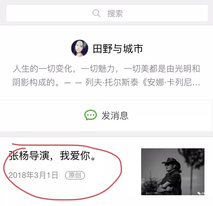 在朋友圈搜索“张杨导演,我爱你”,发现公众号是“城市与田野”。