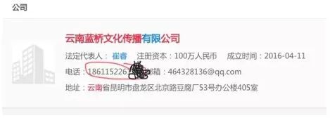 打开企查查,搜索““云南蓝桥文化传播公司”,发现有个电话号码: