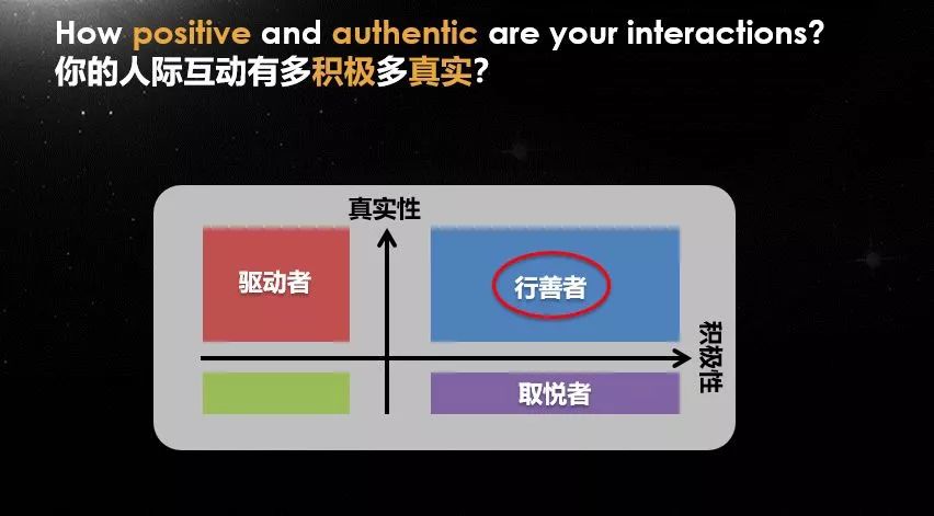 在这个坐标系中,取悦者通常传播积极情绪,使团队更高效、更具创造力;驱动者常传播负面情绪,但更真实,更易被团队成员信任;行善者则兼具积极性和真实性,能够最大程度激活团队能量。