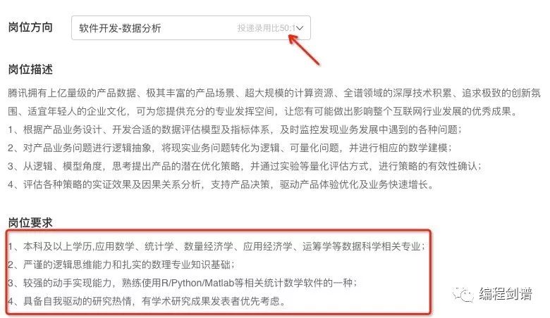 看看投递数据分析方向的比例是多么的吓人(50:1),岗位少,投递人多,竞争太激烈了;看看腾讯对于数据分析师要求的技术栈:数学功底 + Python 脚本,基本上就是这些。