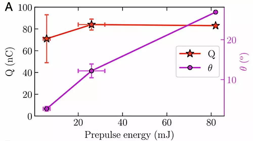 Fig. 3 电子束电荷量和发散角随激光预脉冲能量大小的变化。