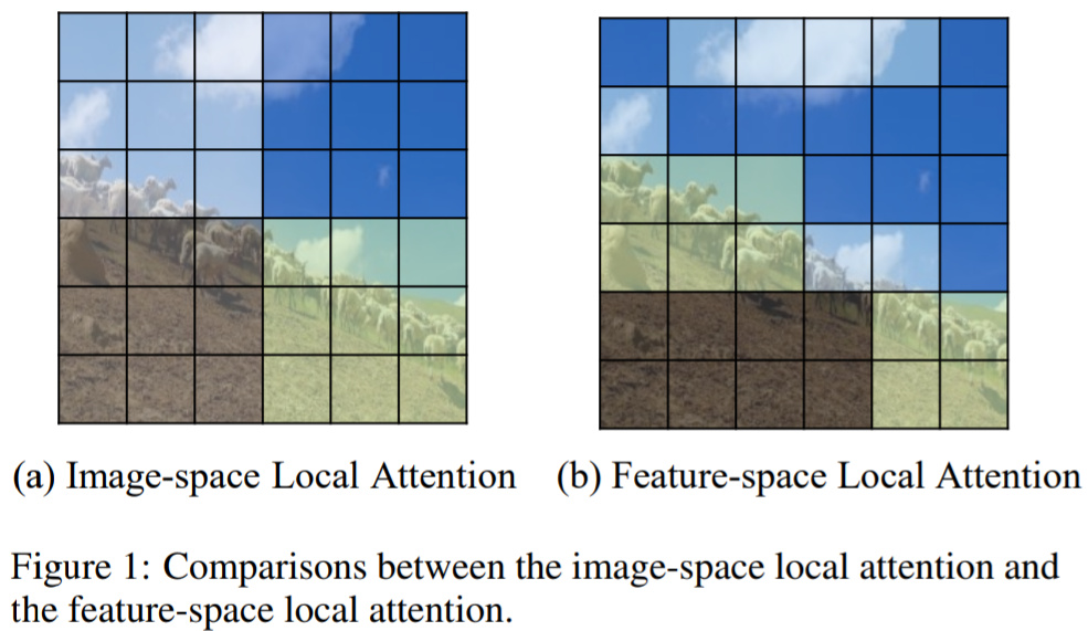 重新思考了局部自注意力机制,提出了特征空间局部注意力(feature-space local attention 或简称 FSLA)。这种局部注意力从图像内容出发,把特征相似的 token 聚成类,并且只在每类特征的内部计算自注意力,相比全局自注意力显著降低了计算量,同时基本保留了原始的全局自注意力机制对远距离特征依赖的建模能力。