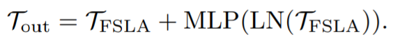 最后,将 FSLA 模块的输出送入另一个归一化层和一个 MLP 模块进行处理,再通过一个短路连接得到整个 bilateral local attention 模块的输出: