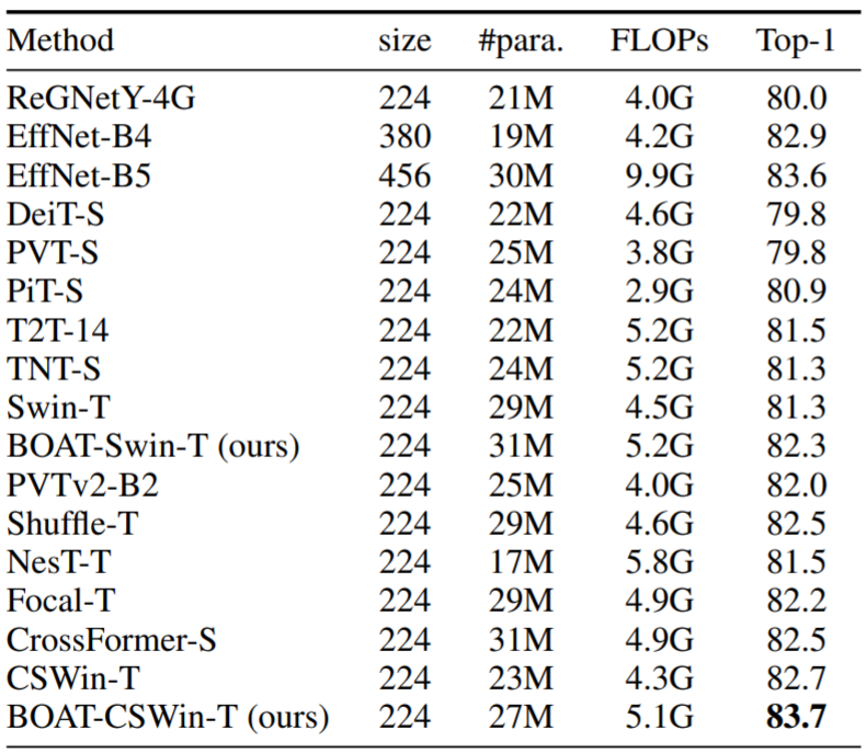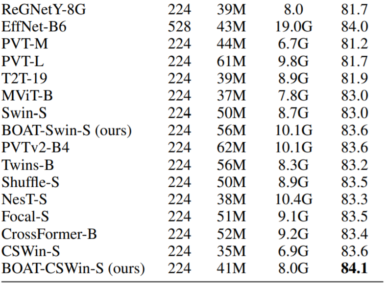 BOAT 遵循与其它 ViT 相同的训练策略。本文使用 ImageNet-1K 的训练集训练模型,输入图像使用 224×224 分辨率,并且没有外部数据。