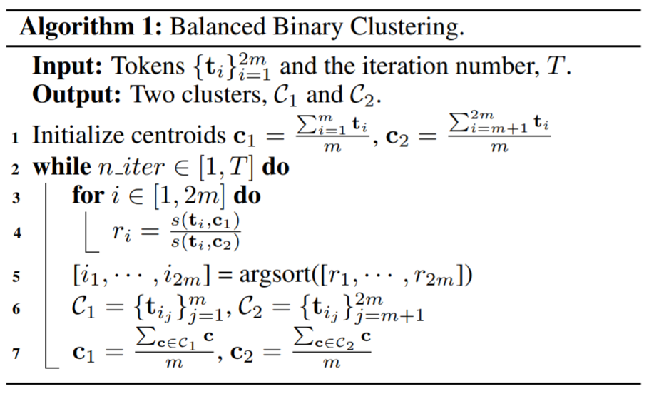 假如某个类组原先有 2m 个 token,均衡二分聚类后得到的每组的 token 数量为 m。与 K-means 类似,均衡二分聚类是一个迭代算法并且依赖于聚类中心。如以下算法所示,在每次迭代对所有 token 进行分组时,先计算每个 token 到两个聚类中心的距离比值,然后把所有 token 按距离比值的递减顺序排序,最后将排序列表前半部分 m 个 token 赋给第一组,后半部分 m 个 token 赋给第二组。
