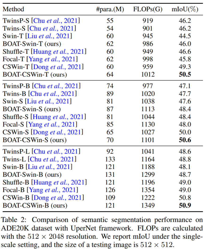 具体来说,训练 300 个 epochs,使用 AdamW 优化器、余弦学习速率调度器和一个线性预热过程。BOAT 在多个数据集上都取得了 SOTA 的效果。比如,在 ImageNet-1K 测试集上,BOAT-CSWin-T 取得了 83.7 的 Top-1 分类准确率;在 ADE20K 语义分割测试集上,BOAT-CSWin-T 的 mIoU 达到了 50.5。