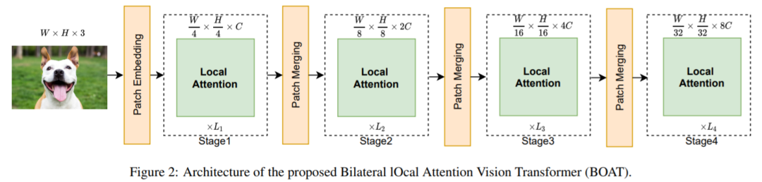 本文中的 ViT 采用了和 Swin 和 CSWin 相同的层次化金字塔架构,由一个 patch embedding 模块和若干个双边局部注意力(bilateral local attention)模块组成。