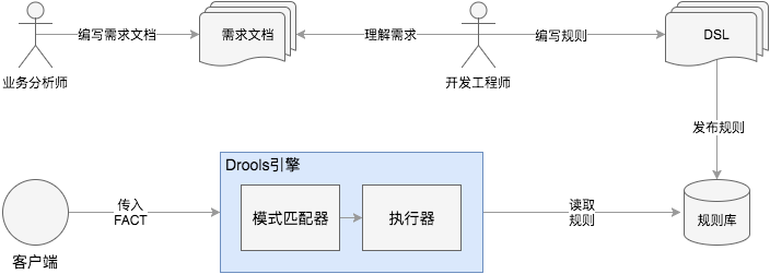 目前最流行的规则引擎应该是Drools, 用 Java 语言编写的开放源码规则引擎,使用 Rete 算法对所编写的规则求值,其操作流程如下: