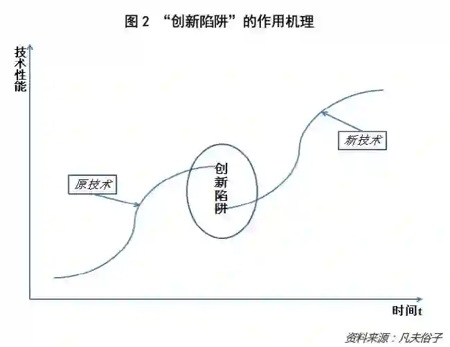 “创新陷阱”正是产生于这种新旧技术的更替过程中(参见图2)。具体来说,对于一家企业,从原有技术轨道跨向新技术轨道是一件不容易的事情;企业越是在自己原有的技术专长上加以创新,便会在原有技术轨道上走得越远;也正因为如此,企业也便越会延滞进入新的技术轨道,进而也越来越遭受旧技术极限的扼制。