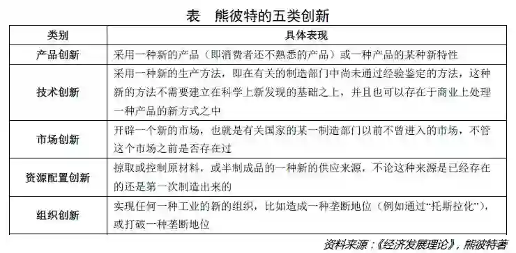 在熊彼特看来,创新包括五种情况,分别为产品创新、技术创新、市场创新、资源配置创新与组织创新,具体如下表: