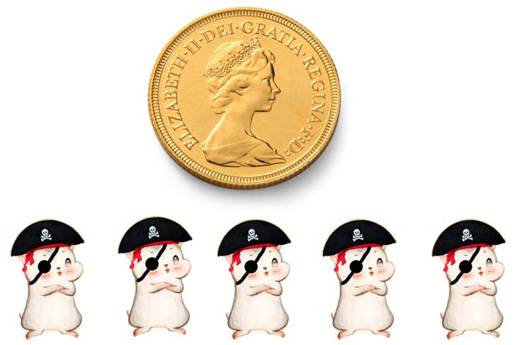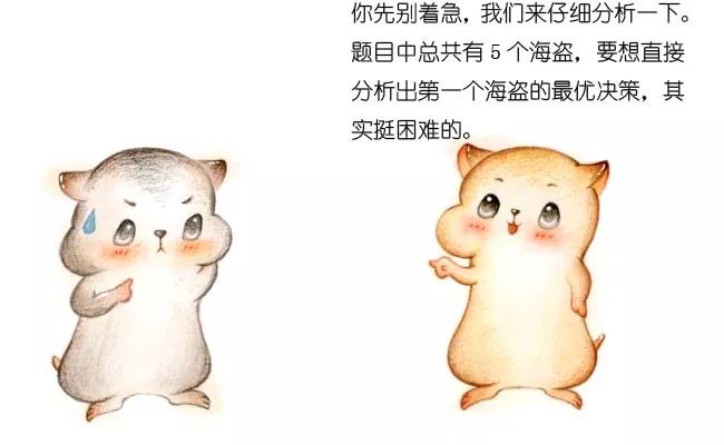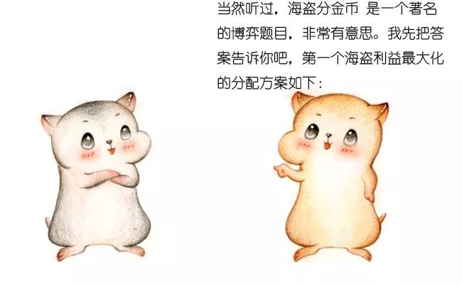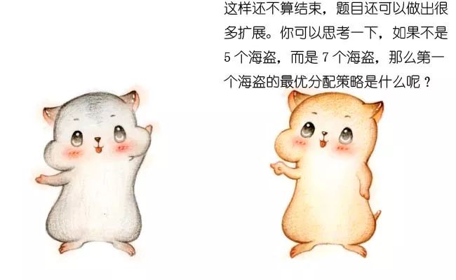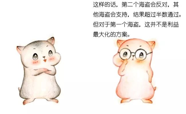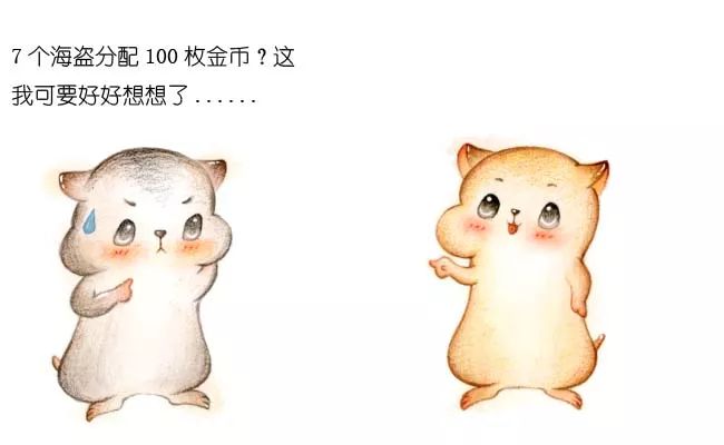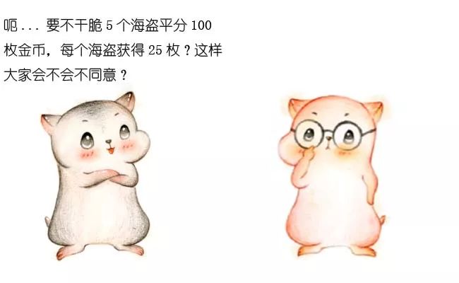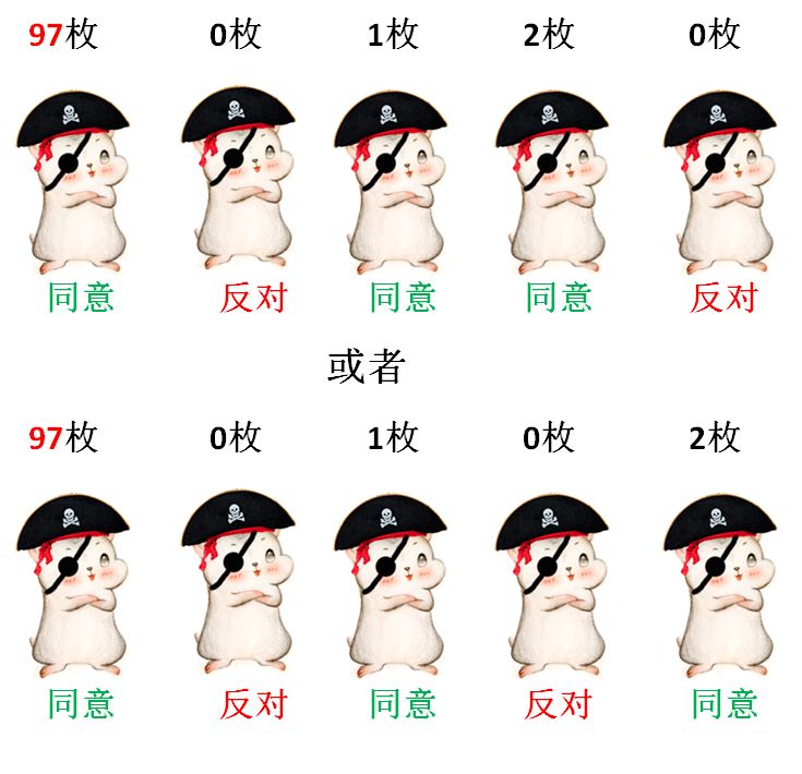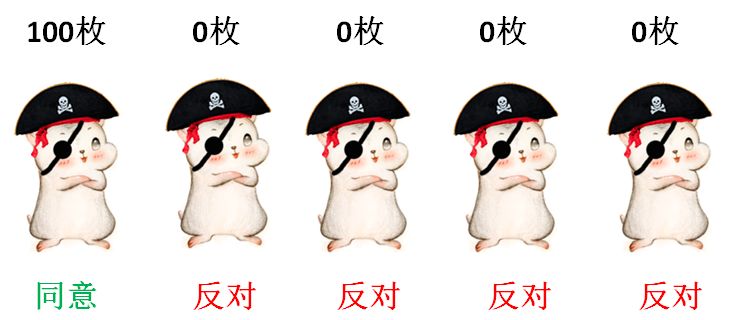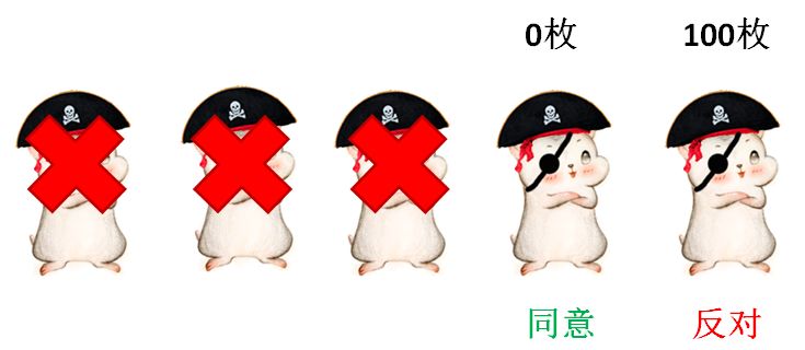 第三个海盗反对,剩下两个小伙伴同意,同意者超过了半数(4 : 1),于是按照这个方法执行了分配。