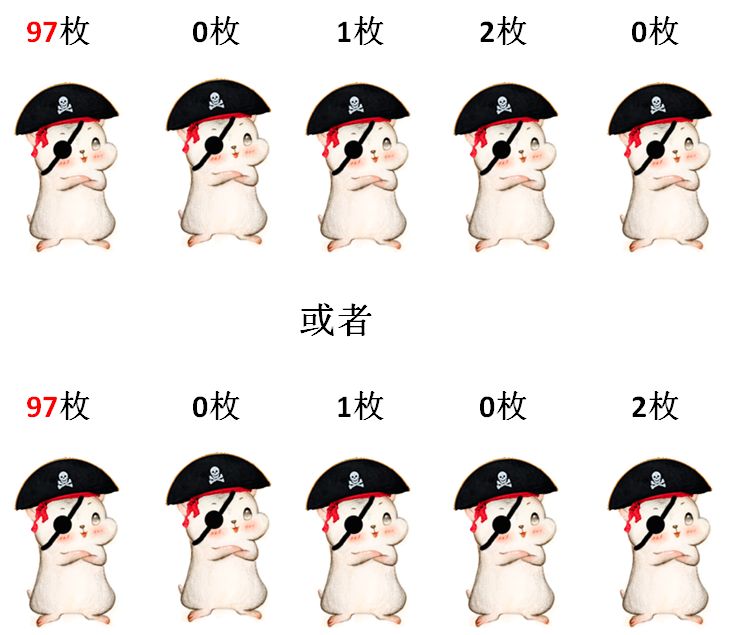 4. 海盗们都是绝对理性的,以自己尽可能多获得金币为目的。但是在收益相等的情况下,会倾向把提出者扔到海里。