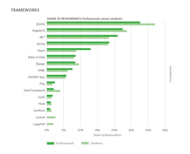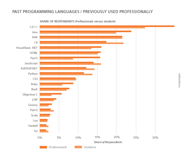 过去一年来,受访者使用的前三大编程语言并没有太大变化。与去年一样,C / C ++(35%),Java(24%)和 PHP(21%)占据榜首。