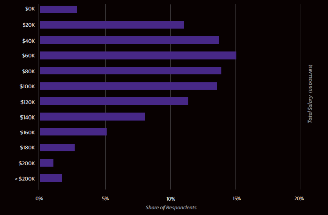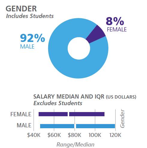 在此次调查中,女性人数只占 8%,女性的平均收入约为 80k 美金左右,男性则获得 93k 万美元,目前情况看,有三分之一的女性受访者的经验不到 5 年,而 83% 男性经验都在 5 年以上。