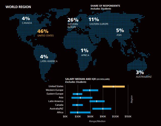 加利福尼亚州的薪金比美国的任何其他地区高出 15 至 20K 美元,中位数为 13.9K 美元。东欧、非洲和加拿大赚得最少。不过这项没有把不同地区的生活成本差异以及各个地区的人才需求考虑进去。