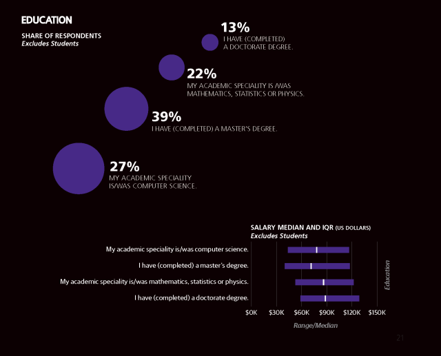 有一半以上的受访者为计算机专业出身,与去年相同。40% 的开发者拥有硕士学位,约 6% 具有博士学位。这种额外的教育似乎得到回报:硕士研究生的薪酬比例高出约 18%,而博士的薪资则要高出高出 45%。