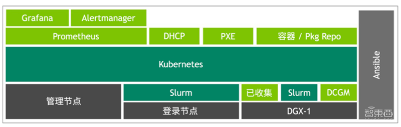 DGX POD 管理软件层由 Kubernete 容器协调框架上运行的各项服务组成,可通过网络(PXE)为动态主机配置协议(DHCP)和全自动 DGX OS 软件配置提供服务。