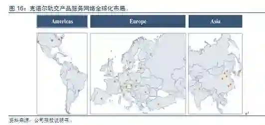 轨交产品领域:克诺尔在全球共拥有36个由公司直营的轨交产品服务中心,这些产品服务中心可以在同一个地点完成维修和保养工作。此外,克诺尔在全球共拥有20个位于客户集中区域的服务站点以提供适应当地市场需求的全方位的支持。
